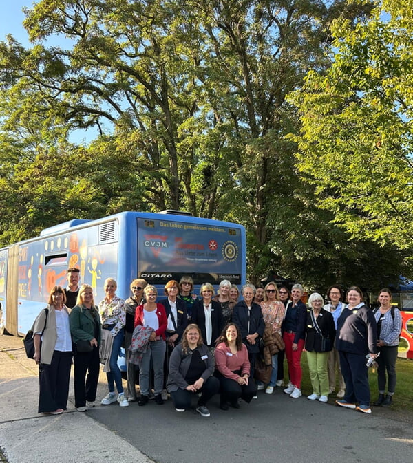 19 Inner Wheelerinnen aus 11 Clubs machten sich Mitte September auf den Weg in das Oderbruch, um unser Distriktprojekt „Blauer Bus“ zu besuchen. Die Anreise war so vielseitig wie wir selbst – 15 Freundinnen reisten mit der Bahn, zwei mit dem Flugzeug und zwei mit dem Auto. Bei der Ankunft am Bahnhof in Strausberg war die Freude groß: ein herzliches Wiedersehen mit den Mitarbeitern/innen des CVJM, die Nähe unter Freundinnen und die Vorfreude auf gemeinsame Tage voller Begegnungen.