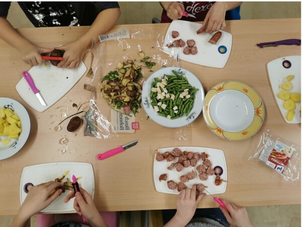 Darüber hinaus üben die Schülerinnen und Schüler die Abläufe beim Kochen und Backen: Rezepte lesen, Zutaten abmessen, Arbeitsschritte planen und im Team zusammenarbeiten. Sie lernen, Verantwortung zu übernehmen, sich gegenseitig zu helfen und geduldig zu sein, bis das Essen fertig ist.